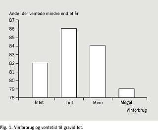 En dansk undersøgelse fra Bedre Sundhed for Mor og Barn-projektet har vist, at kvinder, der drikker vin, og som ønsker at blive gravide, skal vente kortere tid på at blive gravide end de kvinder, som ikke drikker vin [1]. Ud af 39.000 kvinder, der deltog i denne del af kohortens undersøgelse, havde 19.000 planlagt deres graviditet. Af disse ventede 48% under tre måneder på konceptionen, mens 15% ventede i over et år. I ventetiden drak 28% af kvinderne mere end tre glas vin om ugen, mens 8% drak mere end tre øl om ugen, og kun en ganske lille del drak spiritus. Som det fremgår af Fig. 1 var der en større andel af de kvinder, der drak vin, som kun ventede kort tid på den lykkelige begivenhed. Også når man tog højde for forbrug af andre typer af alkohol, alder, fedmegrad, antal tidligere graviditeter, erhvervsstatus, underlivsbetændelser og andre abdominale lidelser havde de kvinder, der drak vin, en signifikant lavere odds-ratio (0,71 (0,64-0,79)) for at skulle vente mere end et år på at blive gravide end de kvinder, der ikke drak vin [1].