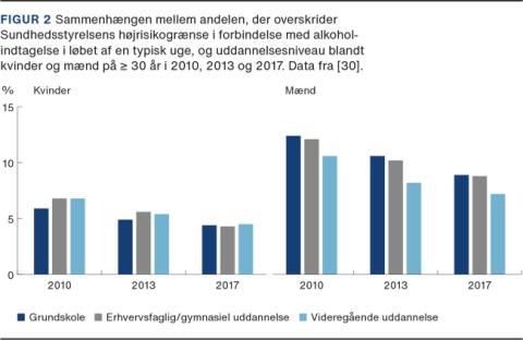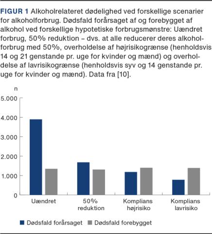 Dansk forskning, der var baseret på fordeling af danskernes alkoholforbrug i 2010 og alkoholrelaterede ætiologiske fraktioner, viste, at et estimeret antal på 4.000 dødsfald om året kunne tilskrives danskernes alkoholvaner (5,0% af alle dødsfald hos kvinder og 9,5% af alle dødsfald hos mænd) [10]. De klassiske alkoholrelaterede sygdomme, som alle kender (pancreas- og leversygdomme) udgjorde kun ca. 20% af dødsfaldene [10]. Størstedelen af de estimerede alkoholrelaterede dødsfald ses blandt personer med et højt alkoholindtag (henholdsvis > 21 og > 14 genstande om ugen for mænd og kvinder). Hvis alle danskeres alkoholindtag var under den nuværende højrisikogrænse på > 21 og > 14 genstande pr. uge for henholdsvis mænd og kvinder og uden forekomst af rusdrikning, ville antallet af dødsfald, der er forårsaget af alkohol, falde med 70% til ca. 1.190, og antallet af dødsfald, der var forebygget af alkohol, ville stige med 4% til ca. 1.400 (Figur 1). Den største reduktion af dødsfald ville man opnå, hvis alle danskere holdt sig under højrisikogrænserne, mens det kun ville medføre en mindre yderligere reduktion i antallet af døde, hvis alle holdt sig under lavrisikogrænserne (henholdsvis > 14 og > 7 genstande om ugen for mænd og kvinder) [10].