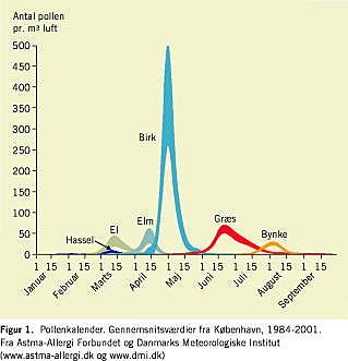 I Danmark ses allergisk sensibilisering mod de sæsonrelaterede udendørsallergener fra løvtræspollen, græspollen, gråbynkepollen og skimmelsvampe (Figur 1) samt mod indendørsallergener fra husstøvmider (house dust mites, HDM,) pelsdyr, fugle og skimmelsvampe. Inhalationsallergi kan tillige udløses af en række erhvervsrelaterede allergener.