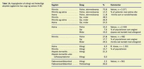 Et væsentligt og centralt emne, som ovenstående nomenklatur ikke belyser i tilstrækkelig grad er den kliniske betydning af en allergi ved de enkelte sygdomme - som tidligere nævnt er kronisk urticaria praktisk talt aldrig allergisk, mens næsten alle med høfebersymptomer i græspollensæsonen er sensibiliserede over for græspollen. Et andet eksempel på vanskelighederne med at tolke en direkte årsagssammenhæng mellem sensibilisering og klinisk sygdom kan findes i den Fynske Skolebørnskohorte, som følger 1.500 nu unge voksne prospektivt [4]. I 1996, da børnene gik i 8. klasse blev de undersøgt for såvel sensibilisering som for klinisk sygdom, og livstidsprævalensen af atopisk dermatitis blev fundet at være 21,3% med en klar statistisk sammenhæng med sensibilisering. Men hvis man samtidig tog højde for at mange af de unge mennesker også havde astma (6,9%) og/eller rinitis (15,7%) forsvandt den kausale sammenhæng med atopisk dermatitis - sensibiliseringen var altså af betydning for astmaen eller riniten og ikke for eksemet, ( Tabel 1A og Tabel 1B ).