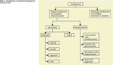 Samtidig er de forskellige sygdomme blevet reklassificerede som allergiske eller ikkeallergiske afhængig af sandsynliggørelse af involvering af immunsystemet og yderligere underklassificeret i de hyppige IgE-medierede reaktioner og de mere sjældne, som har andre tilgrundliggende, immunologiske mekanismer (Figur 1 ). F.eks. vil astma nu underinddeles i ikkeallergisk astma og allergisk astma, hvor sidstnævnte yderligere subklassificeres som IgE-medieret astma eller ikke-IgE-medieret allergisk astma [3].