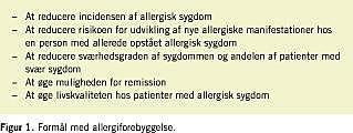 Da allergiske sygdomme ofte debuterer hos børn og unge, hvor allergi også spiller den største rolle for symptomerne, fokuseres der i denne oversigt specielt på denne aldersgruppe. Forebyggelse i relation til erhvervsallergier omtales således ikke. En effektiv symptomatisk farmakologisk behandling er ofte nødvendig, men dette emne behandles ikke i denne artikel.