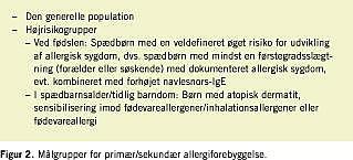 Det er dokumenteret, at atopisk disposition er relateret til en øget risiko for udvikling af allergisk sygdom. Børn med en udtalt atopisk prædisposition kan have en primær immunoregulatorisk defekt, som kan identificeres ved forskellige metoder som f.eks. navlesnors-IgE (NS-IgE) [7, 9]. Desværre er ingen af disse metoder anvendelige til generel screening for allergirisiko, men forhøjet NS-IgE kan sammen med den familiære disposition afgrænse en gruppe af HR-børn til ca. 10% af en fødselsårgang, hvorimod afgrænsning ved hjælp af familiær disposition alene vil give en HR-gruppe på mindst 30% af en fødselsårgang [11]. En gruppe af børn med en veldokumenteret høj risiko for udvikling af allergisk sygdom kan således defineres på baggrund af familiær disposition alene, dvs. mindst en førstegradsslægtning (forældre, søskende) med dokumenteret, behandlingskrævende allergisk sygdom; eller familiær disposition kombineret med forhøjet NS-IgE (Figur 2 ).