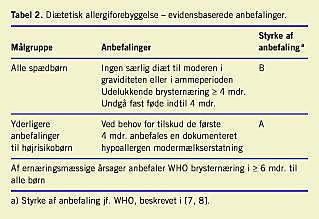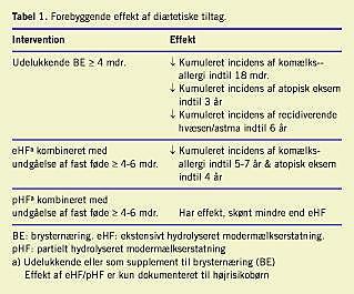 Denne allergiforebyggende effekt er kun påvist hos HR-børn. Der er ingen dokumentation for allergiforebyggende effekt af diæt til moderen, hverken i graviditeten eller i ammeperioden [10], ligesom der ikke er dokumentation for effekt af allergiforebyggende diæt til barnet efter 4-6-måneders-alderen [10]. Effekt af diætetisk primær allergiforebyggelse og evidensbaserede anbefalinger fremgår af Tabel 1 og Tabel 2 .