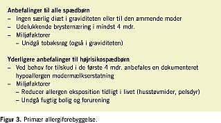 Med basis i aktuel viden er der i Figur 3 opstillet evidensbaserede retningslinjer for primær forebyggelse. Nogle simple diætetiske anbefalinger de første fire måneder har vist sig at kunne reducere risikoen for komælksallergi og atopisk eksem signifikant hos børn med særlig høj risiko for allergiudvikling. Efter firemånedersalderen kan disse børn ernæres som alle andre. Ingen børn bør udsættes for tobaksrøg. Endvidere er der undersøgelser, der tyder på, at reduktion af eksposition for indendørsallergener, især husstøvmider, kan medføre nedsat risiko for astmasymptomer; men resultater af langtidsopfølgning af pågående undersøgelser må afventes.