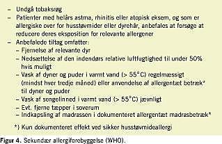 Mange prospektive, kontrollerede undersøgelser har vist at en signifikant reduktion af eksposition for især husstøvmideallergener medfører bedre sygdomskontrol [7, 18, 33, 34]. Hos børn med astma forårsaget af husstøvmideallergi er det i en dansk randomiseret, dobbeltblind placebokontrolleret undersøgelse fundet, at anvendelse af allergentæt madrasbetræk medførte halvering af behovet for inhalationssteroid efter et års opfølgning [35].