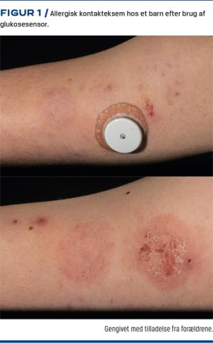 En glukosesensor måler glukosekoncentrationen i interstitialvæsken i subcutis. Den består af en glukosesensortråd, som er et tyndt filament, der bryder huden. Henover sensortråden sidder et plastikkammer, som med et klæbemateriale fæstnes til et specialfremstillet plaster, der holder glukosesensoren fast til huden, og til denne fæstnes en transmitter. Der findes to systemer: flashglukosemonitorering, hvor blodsukkeret måles efter behov, og sensoren skiftes hver anden uge, samt kontinuerlig glukosemonitorering, hvor sensoren skiftes hver 6.-10. dag. I 2016 rapporteredes det første tilfælde af allergisk kontakteksem efter brug af glukosesensor hos en blot to år gammel pige [20]. Siden er der beskrevet yderligere 54 tilfælde hos børn (kommende dansk studie) [18, 19, 21-26]. I alle de rapporterede tilfælde var de forårsagende allergener akrylater, som oftest isobornylacrylat [19, 22-25] eller ethylcyanoacrylat [20, 21] samt abitol og kolofonium [18, 19, 21, 26].