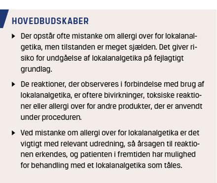 Hvis man fejlagtigt tolker bivirkninger som allergiske, kan det medføre, at patienterne får udført procedurer uden lokalanalgetisk dække pga. frygten for allergi [2]. Mistanke om allergi over for LA bør derfor føre til udredning. Hvis allergi for LA afkræftes, skal det vurderes, om patienterne under indgrebet har været eksponeret for andre allergener. Hvis dette er tilfældet, bør der udredes for disse allergener [7-9]. I denne artikel gennemgås litteraturen på området, og der foreslås en udredningsalgoritme ved mistanke om allergi over for LA.