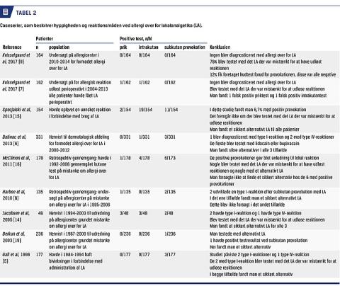 Litteraturen på området er gennemgået på basis af søgning i PubMed med følgende søgeord: local anaesth* OR local anesth* OR interpleural analgesia OR local analgesia OR anesthetics, local AND allergy and immunology OR allergy OR drug hypersensitivity OR drug hypersensitivity. I alt 886 artikler opfyldte søgekriterierne. Abstracts blev gennemlæst, og studier, der var publiceret efter 1990 og havde over 100 inkluderede patienter, hvor subkutan provokation var guldstandard ved vurdering af hyppigheden af allergi over for LA, blev gennemgået. De relevante studier er beskrevet i Tabel 2.