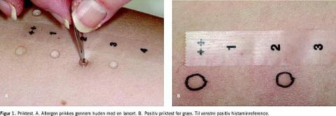 Ud fra anamnesen planlægges der herefter et udredningsprogram, hvor hudtest i form af SPT er den primære undersøgelse. Der findes internationale retningslinjer for, hvorledes SPT skal gennemføres og aflæses. En dråbe allergen appliceres på den volare side af underarmen, hvorefter der prikkes i dråben med en lancet, og størrelsen af den udviklede kvadel måles efter 12-15 minutter. Positiv reaktion defineres som en kvadeldiameter ≥3 mm i forhold til den negative reference (Figur 1 ). Ved priktest med for eksempel friske fødevarer eller materiale fra en patients arbejdsmiljø kan man anvende prik-prik-test, hvor der med samme lancet først prikkes i materialet og derefter i huden på patienten. Specielt ved mistanke om lægemiddelallergi anvendes der ICT, hvor en større mængde allergen appliceres intrakutant. ICT er teknisk mere vanskelig at gennemføre og mindre specifik, men mere sensitiv end SPT. ICT anvendes sjældent hos børn.