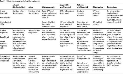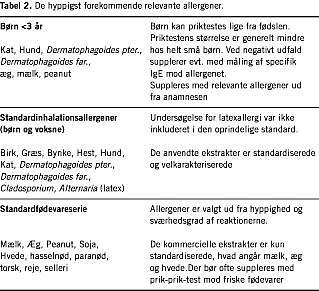 De forskellige procedurer for allergidiagnostik gennemgås i Tabel 1 [3-9]. SPT kan foretages i almen praksis, i speciallægepraksis og på hospital. Udredning af sjældne og alvorlige allergier bør centraliseres. De mest relevante luftvejsallergener er samlet i et standardpanel (Tabel 2 ).