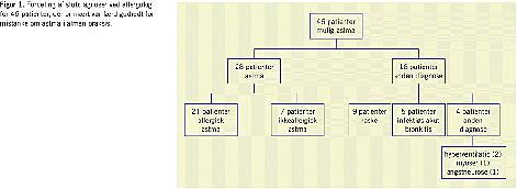 Blandt disse 458 patienter blev der ved lodtrækning udvalgt 83 patienter med mulig astma. De blev skriftligt tilbudt supplerende undersøgelse ved en allergolog. To patienter måtte udgå, da de efterfølgende allerede var undersøgt af en allergilæge, og af de resterende 81 patienter deltog 44 (54%) patienter. Yderligere to patienter, der primært var indkaldt til undersøgelse for høfeber [6], havde tillige astma og blev inkluderet i materialet, der således bestod af i alt 46 patienter.