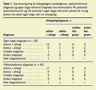 Ved sammenligning af allergologens slutdiagnose med patientrefereret slutdiagnose og slutdiagnose meddelt af egen læge var der hos flertallet (22 ud af 36, 61%) overensstemmelse mellem allergologens og egen læges diagnose, hos ti patienter var egen læge usikker på slutdiagnosen. Otte af dem havde ikke astma som slutdiagnose ved allergologundersøgelsen. Kun to (6%) patienter blev af egen læge diagnosticeret med astma, hvor diagnosen blev afkræftet ved allergologundersøgelsen (Tabel 1). Vedrørende patientrefereret diagnose var der overensstemmelse mellem diagnosen astma hos 26 patienter (59%), mens 12 patienter refererede usikker diagnose, hvoraf igen hovedparten (otte patienter) ved allergologundersøgelsen blev diagnosticeret uden astma. Fem patienter mente, de var diagnosticeret med astma hos egen læge, men havde anden sygdom som slutdiagnose hos allergologen.