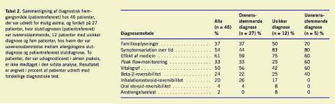 Blandt de 46 patienter, der var udredt for mulig astma var det gennemsnitlige antal diagnostiske tiltag pr. patient på 2,8 (patientrefereret) uden forskel på anvendt diagnostisk fremgangsmåde mellem patienter med overensstemmende slutdiagnoser og patienter, hos hvem der var usikker eller uoverensstemmende slutdiagnoser (Tabel 2).