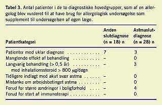Resultater: Hos 65% af patienterne, der var udredt for astma, var den supplerende allergologvurdering uden forslag til større ændringer, mens en tredjedel af de 46 patienter, der var udredt for mulig astma, ville have gavn af supplerende allergologvurdering. Den største gruppe var på syv ud af 18 patienter, der ikke fik slutdiagnosen astma ved allergologvurdering, men som havde kroniske eller recidiverende symptomer. En fjerdedel af de patienter, der havde astma som slutdiagnose, ville have gavn af allergologvurdering på grund af uklar diagnose, sygdommens sværhedsgrad eller muligheden for allergenspecific behandling. Den medicinske behandling af astma i almen praksis fulgte de moderne behandlingsprincipper. Over halvdelen af patienterne med astma kendte basale sygdomsmekanismer og almindelige principper for behandling, men kun få regulerede selv den medicinske behandling.