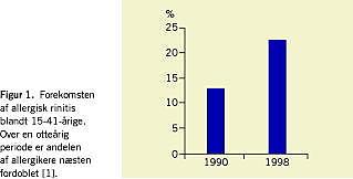 Allergiske sygdomme er folkesygdomme, som er hyppige hos både børn og voksne. I nyere epidemiologiske opgørelser har man påvist, at op mod 20-25% af befolkningen lider af en eller anden form for allergi, og forekomsten er stigende (Figur 1 ). Det gør næppe situationen enklere, at allergi omfatter sygdomme, som ætiologisk ikke er beslægtede, og hvor både diagnostiske og terapeutiske tiltag er vidt forskellige. Dermatologer taler om allergi ved en række eksemsygdomme, der er udløst via en type 4-reaktion (cellulært betinget), og allergologer bruger betegnelsen allergi for de immunglobulin E-medierede sygdomme (og de tilsvarende ikkeimmunologisk udløste identiske sygdomsbilleder). I nærværende sammenhæng opfattes allergologiske sygdomme som astma, rinitis, fødevare-, lægemiddel- og insektgiftudløste sygdomme, urticaria, angioødem samt anafylaksi.