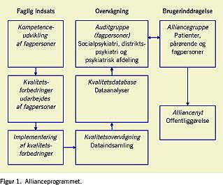 Allianceprogrammet består af tre søjler (Figur 1 ). Den første repræsenterer den faglige indsats, mens den anden søjle omhandler kvalitetsovervågning af indsatsen ved indsamling af data og evaluering af disse data i en auditgruppe. Den tredje søjle omhandler en alliancegruppe, hvor brugerne er repræsenteret. Alliancegruppen vurderede indsatsen ud fra de samme data, som en auditgruppe modtog. Resultaterne af overvågningen og vurderingerne formidledes via Alliance Nyt, der blev uddelt til brugere og fagpersoner i de deltagende sektorer. Hvis overvågningen viste kvalitetsbrist (ved at standarden ikke blev efterlevet), iværksatte en auditgruppe tiltag, der skulle forbedre kvaliteten.