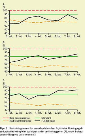 I Figur 2 er den procentvise efterlevelse af de tre standarder angivet. Kontrolgrænserne er beregnet ud fra de enkelte standarders værdi. Målingerne er foretaget kvartalsvis, og hvis de ligger uden for kontrolgrænserne, er det udtryk for en signifikant afvigelse fra standarden. I Figur 2A ses, at samarbejdet ved indlæggelsen i det første halvår afveg signifikant fra den fastlagte standard. Herefter ligger de øvrige målinger indenfor kontrolgrænserne. I hele perioden var der ganske store forskelle mellem afdelingens og de andre sektorers vurdering. For hele den toårige periode vurderede personalet i distriktspsykiatrien/socialpsykiatrien, at standarden blev efterlevet for 67% af patienterne, mens afdelingens personale vurderede, at den blev efterlevet for 81% (p < 0,05). Der var på intet tidspunkt enighed.