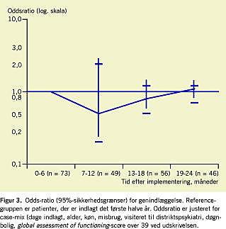 Ved sammenligning af forskellige gruppers alder og GAF-scorer er der anvendt uparret Students t-test. χ2 -test er anvendt ved bivariate analyser. Efterlevelse af de tre standarder blev angivet i kontroldiagrammer med angivelse af øvre og nedre kontrolgrænser [5]. Ved analyser af forskellige gruppers indlæggelsesmønstre i opfølgningsperioden er anvendt oddsratio (OR). Referencegruppen er patienter, der var indlagt det første halvår efter implementering af Allianceprogrammet. OR er justeret for case-mix ved logistiske regressionsanalyser, og der er angivet 95%-sikkerhedsgrænser. Ved de statistiske analyser er som signifikansniveau valgt p < 0,05.
