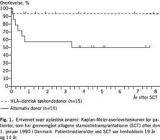 SCT-resultaterne afhænger af patientens alder og donorens egnethed. Hvis patienten er under 40 år og donoren er en HLA-identisk søskende, opnås der en treårsoverlevelse på 70-90%. Til disse patienter foretrækkes SCT som førstevalg. Til yngre patienter med en ubeslægtet donor og til alle patienter over 40 år er immunosuppression førstevalg pga. den øgede risiko for transplantationskomplikationer. SCT er i så fald indiceret ved behandlingssvigt, hvis patienten er under 55 år [2-4]. I Danmark er der siden 1980 blevet udført transplantationer på 47 patienter med SAA. Fig. 1 viser overlevelsesresultater for patienter med SAA efter SCT med henholdsvis søskendedonor og ubeslægtet donor. Disse resultater er sammenlignelige med internationale resultater [4].