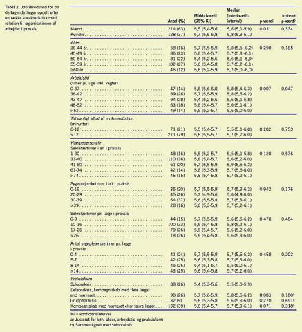 Resultater: I alt deltog 379 læger (83,5%). Størst tilfredshed var der med kolleger og medarbejdere, ansvaret i praksis, friheden til selv at vælge arbejdsmåde og muligheden for at udnytte egne evner. Mindst tilfredshed var der med lønnen og antallet af arbejdstimer. Kvindelige læger var statistisk signifikant mere tilfredse med ansvar i praksis, muligheden for at udnytte egne evner, variationen i arbejdet, antal arbejdstimer og anerkendelsen for et veludført arbejde end mandlige læger. Øget arbejdstid var associeret med lavere grad af jobtilfredshed. Læger med lavere jobtilfredshed havde et ønske om at gå tidligere på pension. Hver 20. (6%) læge ville ikke vælge almen medicin igen som speciale. Lægernes jobtilfredshed var større end hos alment praktiserende læger i Norge og Storbritannien på nær med hensyn til lønforhold.