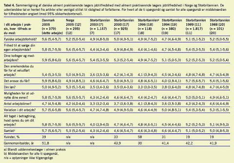 Tilgængelige data for jobtilfredshed er målt med Warr, Cook og Wall-skalaen, som i denne undersøgelse er fra England og Norge i perioden 1989-2005. De undersøgte lægepopulationer var i disse studier (Tabel 4) gennemsnitligt ca. ti år yngre end vores studiepopulation, i et enkelt studie var gennemsnitsalderen 30 år. Andelen af kvinder i disse studier var 19-58%,