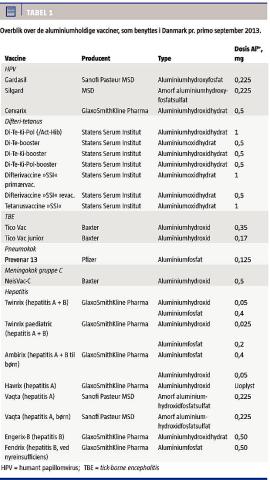 I Tabel 1 gives et overblik over de aluminiumholdige vacciner, som blev benyttet i Danmark pr. primo september 2013. Aluminium indgår også som adjuvanser i præparater til hyposensibilisering ved allergi, som ligeledes kan give granulomer [8], men vil ikke blive omtalt yderligere i denne artikel.