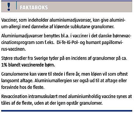 Vaccination with aluminium-adsorbed vaccines can induce aluminium allergy with persistent itching subcutaneous nodules at the injection site – vaccination granulomas. In this article we give an overview of childhood aluminium-adsorbed vaccines available in Denmark. Through literature studies we examine the incidence, the symptoms and the prognosis for the vaccination granulomas and the allergy. Finally we discuss the status in Denmark.