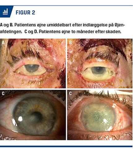 rigeligt pus fra begge øjne, og hævelse af øjenlågene umuliggjorde spontan øjenåbning. Sclerae fandtes hvidlige, corneae var uklare, og der var svært nedsat syn bilateralt. Patientens habituelle syn var normalt. Pga. mistanke om svære øjenskader blev hun overflyttet til Øjenafdelingen på Rigshospitalet-Glostrup (Figur 2 A og B). Her fandt man, at hun kunne se håndbevægelser med venstre øje og havde lyssans på højre øje. Der var limbal iskæmi, kornealt ødem med total korneal epiteldefekt og sterilt pus bilateralt. Der blev påbegyndt dråbebehandling som ved svær okulær ætsningsskade. En orbital CT viste ingen intraokulære fremmedlegemer, men indikerede postseptal cellulitis, og der blev påbegyndt i.v. antibiotikabehandling. Under indlæggelsen sås beskeden bedring af den limbale iskæmi og beskeden opheling af de korneale epiteldefekter. Ved tomånederskontrol fandtes en synstyrke på 0,4 på højre øje og fortsat svært nedsat syn på venstre. Højre øje havde pænt epiteldække og et centralt stromalt ar. Venstre øje havde begyndende epitelindvækst med central defekt og karindvækst og cikatrielle forandringer i den limbale zone (Figur 2 C og D).