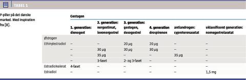 I artiklen belyses to af PP’s bivirkninger hos teenagere: VTE og nedsat BMD. Artiklen omhandler PP, der indeholder ethinylestradiol (EE), estradiol, eller estradiolvalerat (E2) i kombination med 1.-4.-generations gestagen (Tabel 1) [8]. Inkluderet er artikler, der omhandler kvinder, der på interventionstidspunktet var ≤ 20 år. Artikler, der omhandler TE, hvor separate tal for incidensrate (IR) for teenagere ikke præsenteres, er ekskluderet.