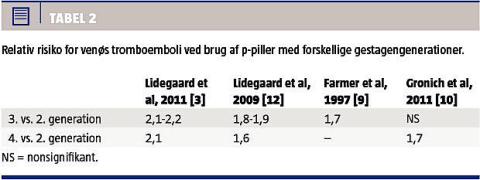 Lidegaard et al fandt, RR for VTE ved brug af hhv. anden-, tredje- og fjerdegenerations PP med 30-40 mikrogram EE sammenlignet med ikkebrug var hhv. 2,9-3,5, 6,2-6,6 og 6,4 [3]. Flere studier viste en højere risiko for VTE ved brug af PP med tredje- og fjerdegenerationsgestagen end ved brug af PP med andengenerationsgestagen (Tabel 2).