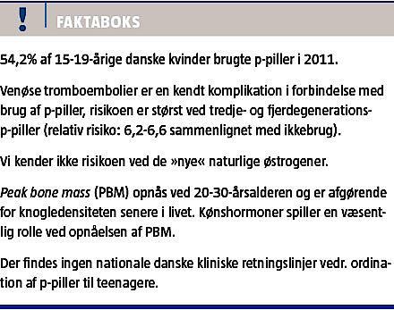 Hvorvidt brug af PP i teenageårene medfører nedsat BMD-tilvækst og dermed lavere PBM, og om en evt. forskel er vedvarende og klinisk relevant, vides ikke. Man har i få studier påvist marginalt nedsat BMD hos PP-brugere. Ud fra den nuværende viden er det nærliggende at anbefale PP med lavdosis-EE og andengenerationsgestagen til teenagere. Endvidere bør man forsøge at begrænse pauser i brugen af PP, da risikoen for VTE er størst ved opstart.