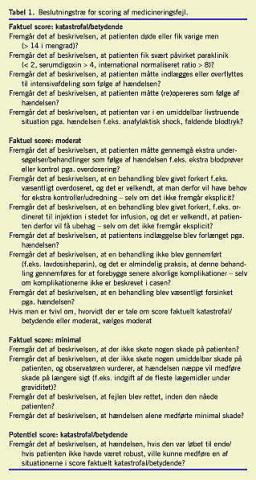 Der blev anvendt en score for alvorlighed, som benyttes både nationalt [3-6] og internationalt [7], og som involverer fire kategorier, hvor de to alvorligste oftest slås sammen. Vurdering af en hændelse baseres på et fagligt skøn og er subjektiv. Der scores efter såvel faktuel skade på patienten som potentiel skade - dvs. den skade, patienten kunne være blevet udsat for, hvis hændelsen var forløbet til ende. I Tabel 1 vises beslutningstræet for scoringen.
