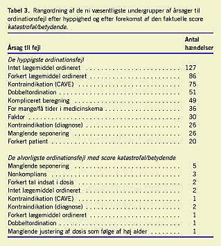 Resultater: Medicinordinationsfejlene fordelte sig på 98 lægemidler, heraf medførte ni lægemidler 18 alvorlige skader på patienter. Fejlene fordelte sig med 46,0% fejl ved valg af præparat, 47,7% fejl ved valg af dosering og 6,3% fejl i form af dobbeltordinationer. De hyppigst involverede lægemidler var penicillin og warfarin. De lægemidler, som hyppigst forårsagede alvorlig patientskade, var insulin og warfarin. De hyppigste årsager til fejl var »intet lægemiddel ordineret« og »valg af forkert præparat«. De årsager, som lå bag fejlene med de mest alvorlige konsekvenser for patienterne, var »manglende seponering« (sevofluran og insulin) og »kompliansproblemer« (warfarin og insulin). Et gennemgående træk ved fejlenes opståen er fejl i håndtering af information.