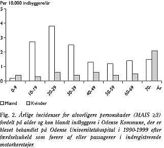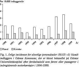 Trods Færdselssikkerhedskommissionens handlingsplan har vi ikke kunnet registrere et fald i antallet af alvorligt tilskadekomne efter uheld med indregistrerede motorkøretøjer. Den årlige incidens har derimod været stigende blandt indbyggerne i Odense Kommune siden midten af 1990'erne. I samme periode har antallet af trafikdræbte været uændret. Vi påviste en gennemsnitlig årlig incidens på 0,7-1,4 tilskadekomne per 10.000 indbyggere/år. Den højeste incidens af trafikskader forekom blandt yngre mænd, mens den højeste incidens af trafikskader hos kvinder forekom blandt de ældre. Samme fordeling findes i andre undersøgelse (6-10). En del af forklaringen på denne fordeling er, at en stor del af de tilskadekomne i busser var ældre kvinder, der var kommet til skade som passagerer. De havde ved ulykkerne pådraget sig hoftenære frakturer med AIS 3 til følge. For denne frakturtype ved man, at der på grund af osteoporose er højere incidens hos kvinder.