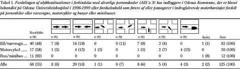 Materiale og metoder: Vi inkluderede alle i Odense Kommune bosiddende personer, der havde haft alvorlige personskader (MAIS ≥3) efter færdselsuheld som førere eller passagerer i indregistrerede motorkøretøjer og var blevet behandlet på Odense Universitetshospital i perioden fra den 1. januar 1990 til den 31. december 1999.