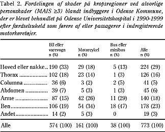 Tabel 2 viser fordelingen af personskaderne fordelt på kropsregioner. I alt registrerede vi 773 skader hos de 241 tilskadekomne personer svarende til 3,2 skader per person. Hoved- og nakke/halstraumer var de hyppigste skader blandt bilister (33%), mens underekstremitetstraumer var hyppigst blandt motorcyklister og buspassagerer (34% og 47%). Columna- og abdominaltraumer udgjorde samlet kun en mindre del af alle skaderne.