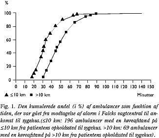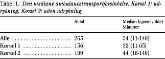 Den mediane transportforsinkelse var 34 minutter (spændvidde 11-140 minutter). 35% af ambulancerne var mere end 40 minutter om at nå frem til sygehuset. For patienter, som opholdt sig under 10 km fra Odense Universitetshospital, var den mediane transportforsinkelse 31 minutter (11-140 minutter), 25% af transporterne varede mere end 40 minutter. For patienter med en køreafstand på mere end 10 km var den mediane transportforsinkelse 48 minutter (23-89 minutter), her varede 65% af transporterne mere end 40 minutter (Tabel 1, Fig. 1). Den længste køreafstand var 35 km. For 14 ambulancer kunne transportforsinkelsen ikke beregnes på grund af manglende registrering af tidsoplysninger. Udrykningstransporter udgjorde 56%, og transportforsinkelsen for disse var signifikant kortere end for transporter uden udrykning, 30 minutter versus 47 minutter, p<0,001. For 156 tra nsporter var den mediane tid fra ambulancens ankomst hos patienten, og til transport til sygehus blev påbegyndt, syv minutter (2-21 minutter). For resten af transporterne manglede denne tidsoplysning.