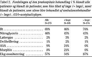 Resultater: 279 patienter (83%) blev transporteret i ambulance. Halvdelen af ambulancerne var ankommet til sygehus 34 minutter (spændvidde 11-140 minutter), efter at alarmen var registreret i Falcks vagtcentral, mens hver tredje ambulance var mere end 40 minutter om at nå frem til sygehuset. Udrykningstransporter, som udgjorde 56%, var signifikant hurtigst med en median varighed på 32 minutter (11-65 minutter). Ilt blev givet i ambulancen til 69% af patienterne, nitroglycerin sublingvalt til 46%, lattergas (Alnotox) til 2%, defibrillering til 1,4%, acetylsalicylsyre til 9%, morphininjektion til 8% og ekg-monitorering blev foretaget hos 57%.