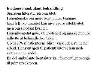 Kontinuitet i behandlerkontakten var et patientønske i flere af undersøgelserne, og dette er samstemmende med amternes servicemål. I flere undersøgelser påviste man større effektivitet og mindre ressourcekrav, når der blev indført kontinuitet. I to undersøgelser fandtes kvaliteten nedsat ved kontinuitet, idet kvalitet var defineret bredt og ikke ens i undersøgelserne. Ventetid medfører utilfredshed blandt patienterne, og resultaterne i en enkelt undersøgelse tyder på mindre udbytte af behandling og information, når der er ventetid. Udeblivelser er et udbredt problem og påvirker op til 29% af de reserverede tider. Mere hensyntagen til patientfaktorer ved reservation og kontinuitet i behandlerkontakten kan nedbringe udeblivelserne. En del konsultationer i hospitalernes ambulatorier kunne formentligt overgå til primærsektoren. Den manglende afslutning skyldes usikkerhed og manglende kendskab, særligt blandt de yngste læger, til primærsektorens evner.