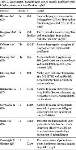 Der er fundet to randomiserede og syv ikkerandomiserede artikler om kontinuitet i almen praksis. Som det fremgår af Tabel 2 , viser de fleste arbejder øget effektivitet og/eller bedre behandling. For eksempel fandt Heagarty et al, at antallet af parakliniske undersøgelser var mindre i gruppen med kontinuitet i læge-patient-forholdet. Som eksempel herpå kan nævnes patienter med øvre luftvejslidelser; 0,9% mod 7,0% i kontrolgruppen fik foretaget røntgen, og 0,9% mod 4,7% fik antibiotika (13).