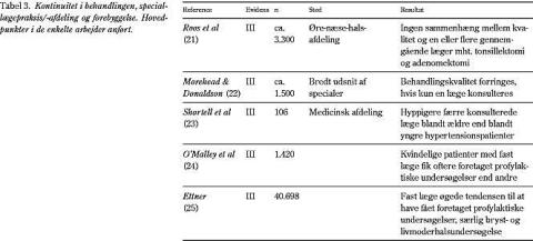 Der er fundet fem ikkerandomiserede undersøgelser, som ikke specifikt omhandler medicinske ambulatorier eller almen praksis, men inddrager fx speciallægepraksis. Tabel 3 viser resultaterne. I to undersøgelser fandt man, at kvaliteten forringes ved kontinuitet. Således fandt Roos et al i en retrospektiv opgørelse af ca. 3.300 tonsillektomerede eller adenomektomerede patienter (både primær- og sekundærsektor), at der ikke var nogen sammenhæng mellem kvalitet og kontinuitet. Kvalitet blev målt som korrekt operationsindikation og nedsat frekvens af symptomer efterfølgende (21). Morehead et al påviste, at behandlingens kvalitet blev forringet, hvis patienten kun blev tilset af en enkelt læge (39 lægecentre, 5-35 patienter udtrukket hvert sted, disse blev retrospektivt gennemgået). Kvaliteten var her bedømt ud fra et pointsystem, der inddragede anamnese, diagnostik, behandling og patienttilfredshed (22).