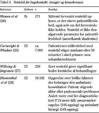 Der er foretaget mange opgørelser over ventetiden i forskellige sektorer, men her vil kun arbejder, der opgør konsekvenser af eller interventioner mod ventetiden blive refereret. Amtslige mål i Danmark og National Health Service (NHS) mål i England (http://www.NHS.uk 5. april 2001) sigter enslydende mod maksimalt 30 minutter ved ambulante aftaler. Som det fremgår af Tabel 4 , øges patienternes utilfredshed med ventetiden, og en enkelt opgørelse antyder, at patienternes udbytte af lægekontakten nedsættes.