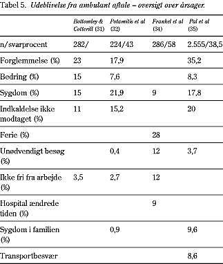 Hovedparten af de fundne undersøgelser under dette emne er foretaget på egentlige hospitalsambulatorier. Udeblivelsesprocenten svinger i disse undersøgelser mellem 5,3 og 29 (29-33), og årsagerne til udeblivelser fremgår af Tabel 5.Lloyd et al viste i en engelsk spørgeskemaundersøgelse på en medicinsk afdeling (n = 1.492), at hverken sygdommens natur, alvorlighed eller varighed havde relation til udeblivelse. Patienter, som ikke eller kun delvist havde diskuteret sygdommen med deres praktiserende læge, var mindre tilbøjelige til at udeblive (30). Frankel et al viste i et casekontrolstudie af udeblivelser ved første besøg på seks forskellige hospitalsambulatorier (n = 274), at gennemsnitsalderen på udeblevne patienter var signifikant lavere end på fremmødte patienter, og at udeblevne patienter havde modtaget besked om besøget signifikant senere (34). Read et al redegør som de eneste for udvælgelse, frafald mv. i forbindelse med intervention over for udeblivelser. I det pågældende ambulatorium indførte man, at patienten selv skulle ringe for at få en tid som passede - udeblivelsesprocenten var 2,5% blandt de patienter, som ringede (n = 769), mod 10-11% tidligere (36). Hamilton et al undersøgte i en engelsk undersøgelse (n = 1.861, styrke Ib) effekten af, at patienten fik tilsendt en kopi af henvisningen til ambulatoriet. Der var ingen forskel på udeblivelsesprocenten før og efter ændringen (5,3 vs. 5,5) (33). Som nævnt under kontinuitet, mindskede Poland andelen af udeblivelser fra 26,5% til 11,5% ved den ikkelægelige prænatale kontrol ved at indføre kontinuitet blandt de konsulterede behandlere (n = 78) (6).