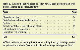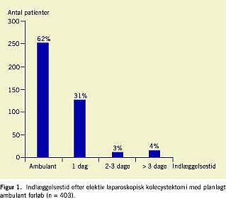 Resultater: I løbet af to år fik i alt 535 patienter foretaget kolecystektomi. Heraf var 403 operationer elektive, og 62% af disse blev gennemført ambulant. 94% af patienterne blev udskrevet inden for et døgn. Hos 2% sås der komplikationer, der medførte indlæggelse i mere end tre dage, og hos 2,7% måtte operationen konverteres. Ca. en tredjedel havde brug for lægekontakt efter udskrivelsen, og 4,3% blev genindlagt. Smerter var en af de væsentligste postoperative gener. Omkring 90% af patienterne var tilfredse med det samlede forløb.