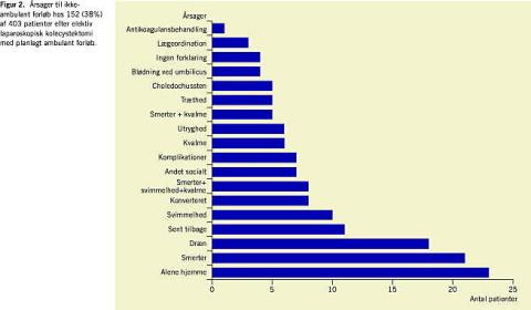 Der er tre kategorier af årsager til manglende gennemførelse af det ambulant forløb. Sociale eller logistiske faktorer (alene hjemme, sen operation) var hos os årsagen hos 27%. Som hovedregel medførte dette alene en enkelt overnatning. Postoperative gener (smerter, kvalme svimmelhed, utryghed etc.) var årsagen i 40% af tilfældene og medførte ligeledes typisk en enkelt overnatning. I alt blev 94% af de elektive patienter udskrevet inden for et døgn. Komplikationer eller vanskelig operation med efterfølgende drænbehandling eller konvertering var årsagen til indlæggelse hos 28% og medførte, især ved komplikationer eller konvertering, indlæggelser i mere end et døgn.
