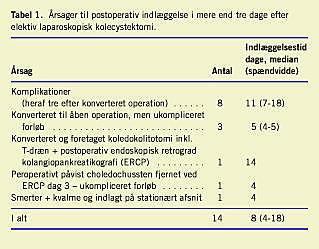 Indlæggelser over tre dage skyldtes typisk komplikationer, konvertering til åben operation eller behandling af choledochussten (Tabel 1 ). Hos otte patienter (2%) var årsagen komplikationer. En fik ved endoskopisk retrograd kolangiopankreatikografi (ERCP) anlagt stent pga. sidehul i ductus hepaticus sin., tre (0,7%) havde cysticuslækage, der blev behandlet med ERCP og/eller reoperation, en havde subhepatisk hæmatom og absces, en fik pankreatitis forårsaget af postoperativ ERCP pga. choledochussten, og en blev reopereret for blødning ved umbilikalporten. En patient (0,2%) døde postoperativt. Det var en 77-årig kvinde med aorta- og mitralinsufficiens, der pga. vedvarende symptomer blev opereret elektivt tre måneder efter akut kolecystitis. Hun var tidligere blevet opereret for ileus, og der opstod ved indledningen af operationen tarmlæsioner, og man konverterede. Læsionerne blev oversyet, men patienten måtte reopereres fire dage senere pga. fornyet perforation. Hun døde postoperativt dag 13 som følge af peritonitis og sepsis.