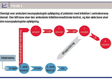 Forløbet er skitseret i Figur 1. Ved den første ambulante kontrol spørges der specifikt ind til hukommelsesproblemer, koncentrationsbesvær, træthed og depression, og herefter tages der stilling til behovet for neuropsykologisk vurdering, hvortil der er afsat tre sessioner og afsluttes med en skriftlig afrapportering til den henvisende kontaktlæge. Rapporten indeholder fund og forslag til eventuelle tiltag, f.eks. henvisning til et hjerneskadecenter mhp. nærmere vurdering.