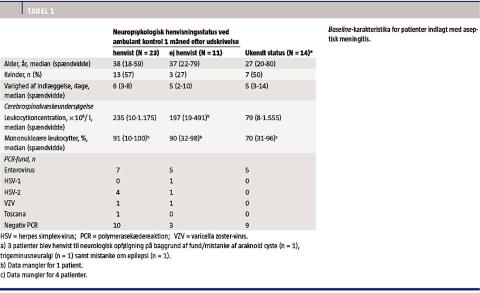 Kognitiv dysfunktion syntes at persistere i et år efter indlæggelsen hos en større del af de 14 patienter med AM. Disse observationer er præliminære, og man kan ikke drage endelige konklusioner. Der er behov for systematisk ambulant neuropsykologisk opfølgning og sammenligning med kontrolgrupper, der har f.eks. anden infektionssygdom eller CNS-patologi. I et studie af bakteriel meningitis er der påvist forbedring i kognitiv funktion i op til ti år efter infektionen [5].