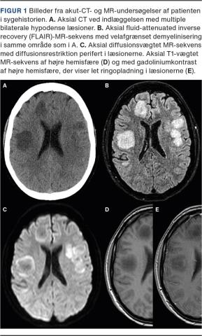 I de efterfølgende dage sås gradvis forværring af tilstanden til svær tetraparese og akut nyre- og respirationssvigt. Ved MR-skanning af cerebrum med kontrast viste de før sete læsioner hyperintenst signal på en fluid-attenuated inverse recovery (FLAIR)-sekvens samt perifer diffusionsrestriktion og kontrastopladning (Figur 1B-E), hvilket var anledning til arbejdsdiagnosen akut demyeliniserende lidelse. Yderligere blod- og spinalvæskeprøver blev analyseret for reumatologiske og infektiøse årsager, inkl. hiv, syfilis, Borrelia og virus.